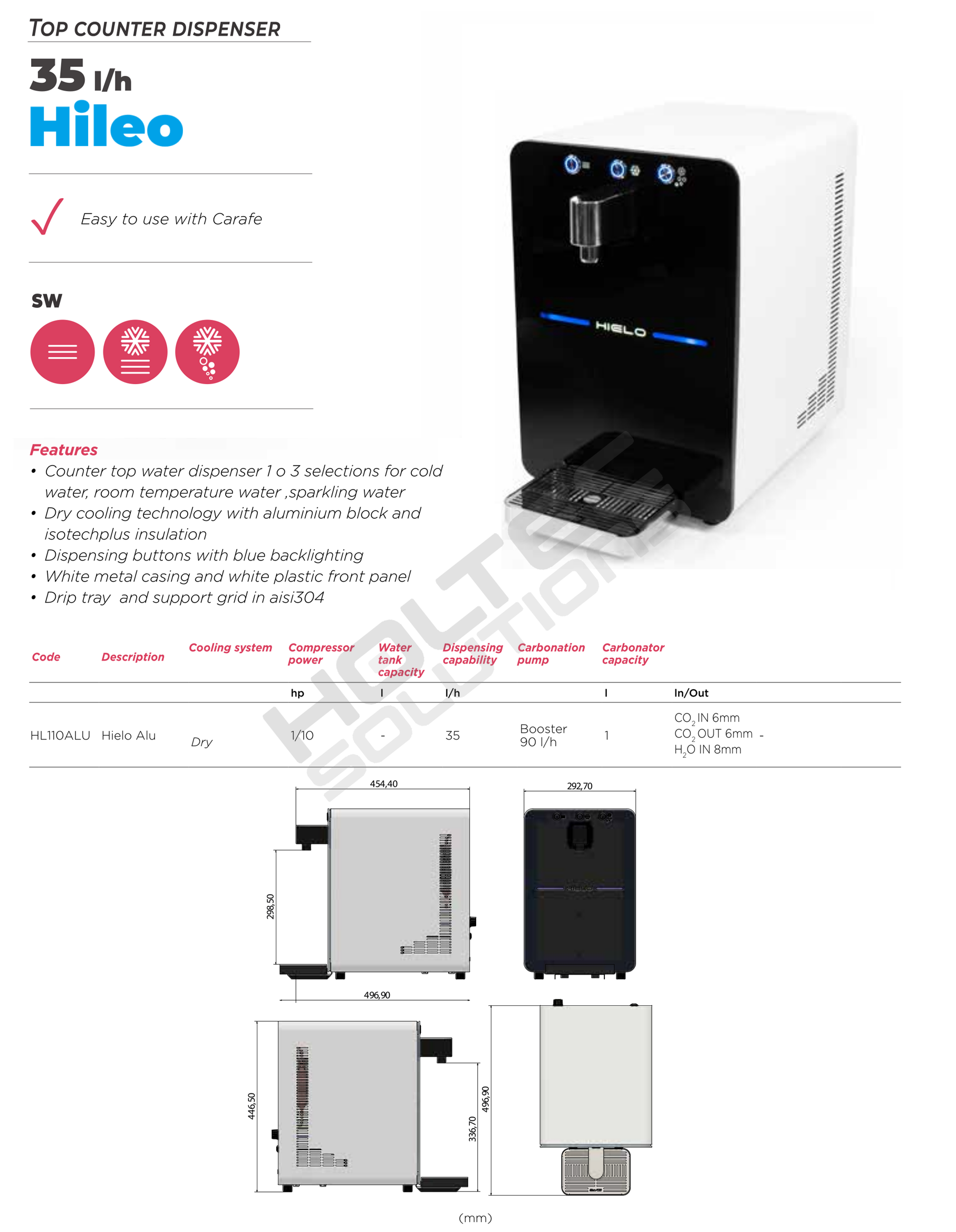 Med en ydelse på 35 liter i timen sikrer Hielo en stabil forsyning af friskt og afkølet vand – både almindeligt og danskvand. Perfekt til større arbejdspladser eller serveringsområder, hvor der tappes hyppigt i løbet af dagen.