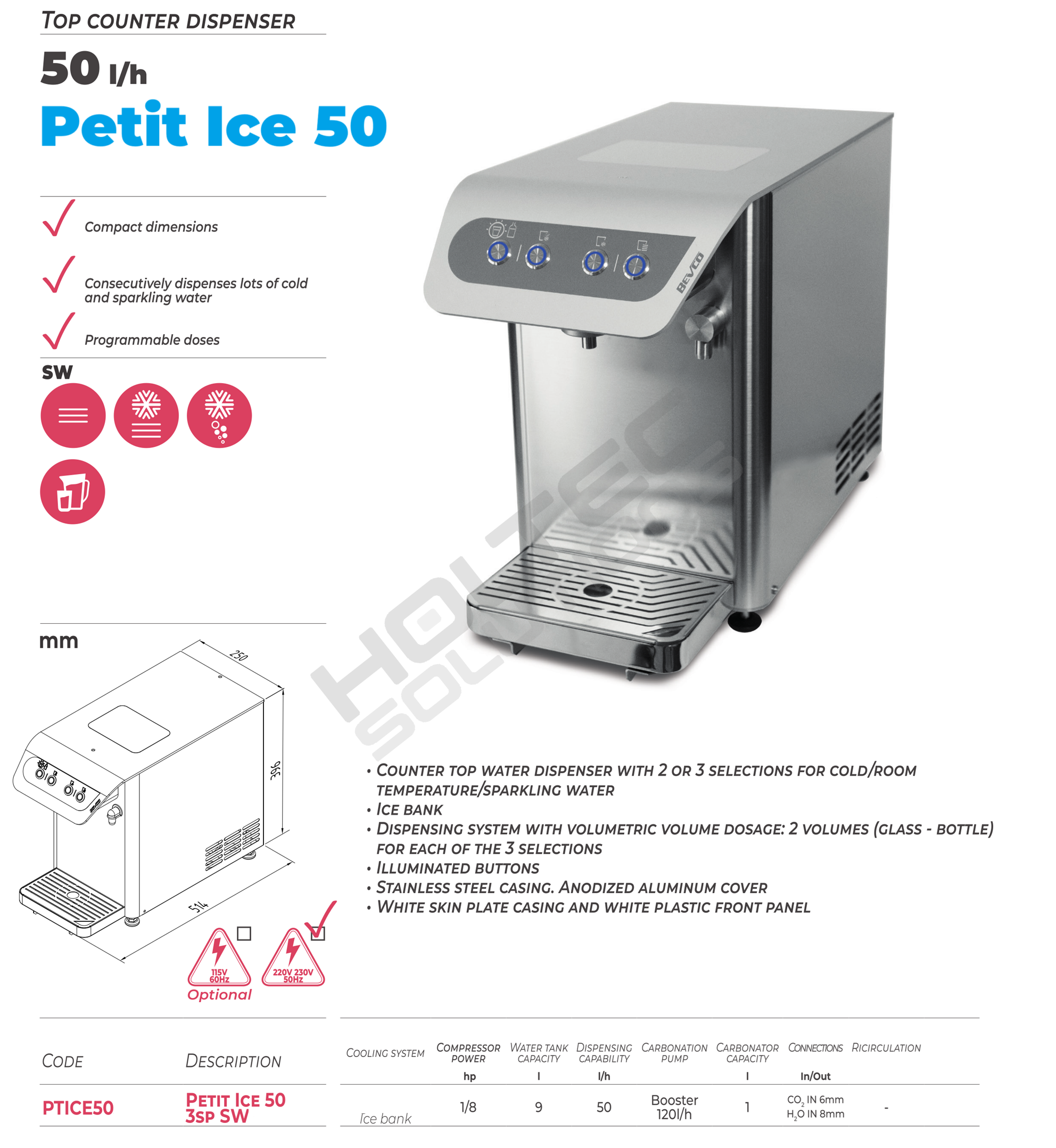 Med en ydelse på 50 liter i timen sikrer petit Ice en stabil forsyning af friskt og afkølet vand – både almindeligt og danskvand. Perfekt til større arbejdspladser eller serveringsområder, hvor der tappes hyppigt i løbet af dagen.