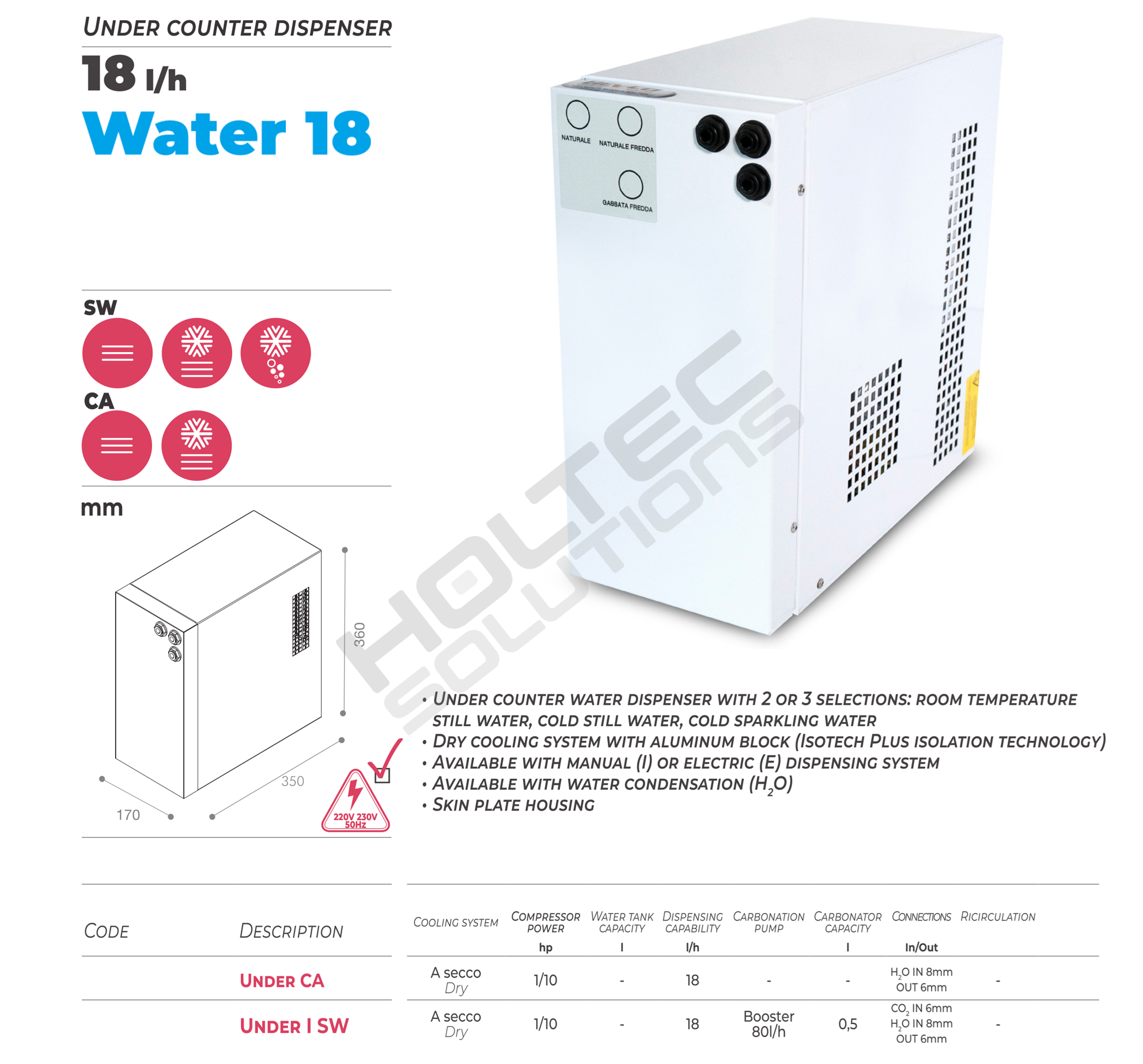 Med en ydelse på 18 liter i timen sikrer Water 18 en stabil forsyning af friskt og afkølet vand – både almindeligt og danskvand. Perfekt til mindre arbejdspladser, konter eller private steder, hvor der tappes i løbet af dagen.
